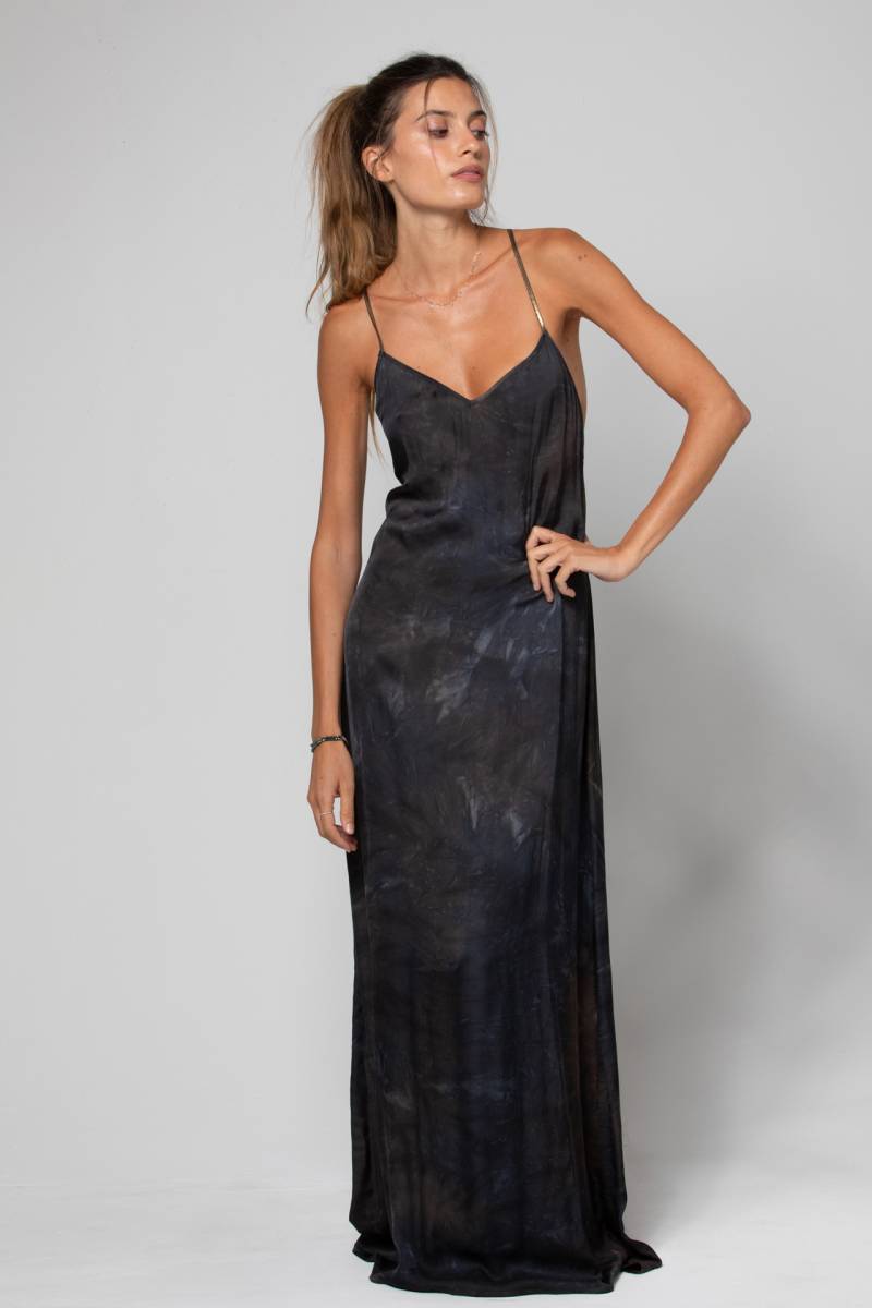 Adoptez la robe Dina Black Malt longue fluide avec décolleté en V et bretelles dorées croisées dans le dos pour un style élégant, féminin et intemporel qui fera tourner toutes les têtes cet été.