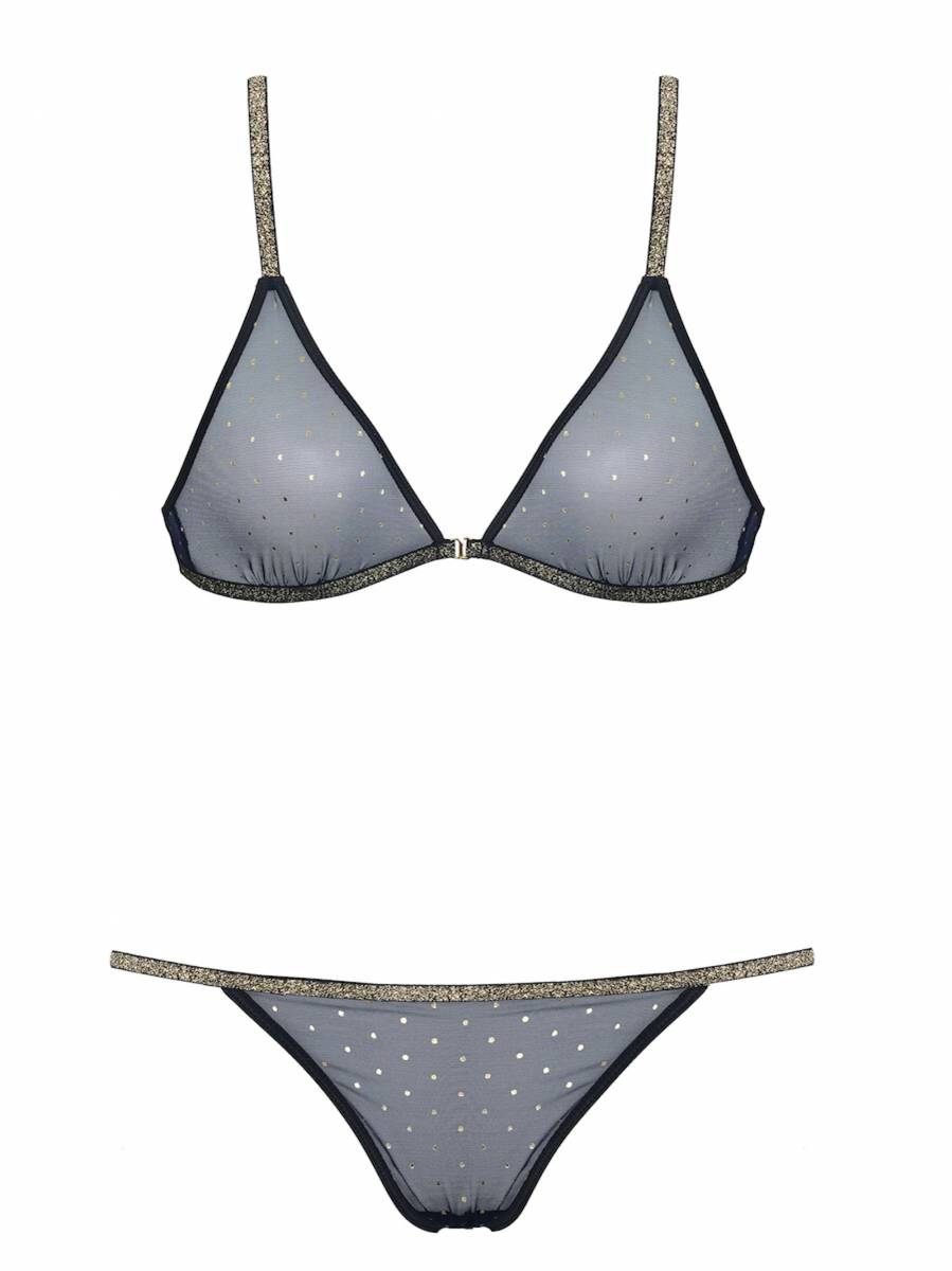 L'ensemble transparent femme soutien-gorge triangle bleu à pois doré, bretelles dorées et dos nageur, accompagné de la culotte fine à détail or est l'ensemble parfait pour les femmes qui cherchent à ajouter une touche de fantaisie et de sophistication à leur garde-robe. Le tissu transparent ajoute la touche de sensualité dont les femmes ont besoin tout en étant confortable à porter.