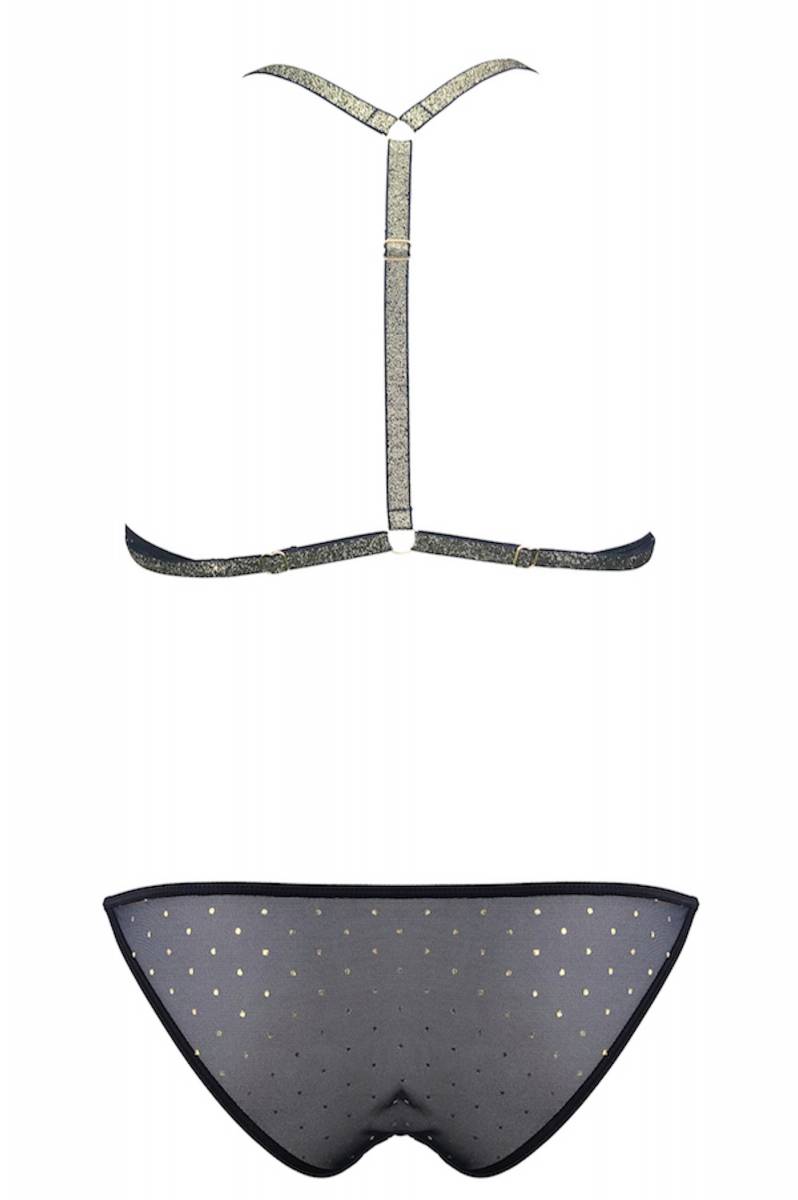 Tendance et pratique, cet ensemble avec ouverture à l’avant mettra en valeur tout types de poitrines, grâce à son universelle coupe triangle. Son élégant dos nageur lié grâce à de sensuelles bandes dorés apporte délicatesse et volupté à n'importe quel look, pour toutes occasions, et le rappel de celles-ci sur la fine et légère culotte complètent harmonieusement le style de l’ensemble. La culotte de cet ensemble saura mettre en valeur et embellir les courbes de vos hanches.