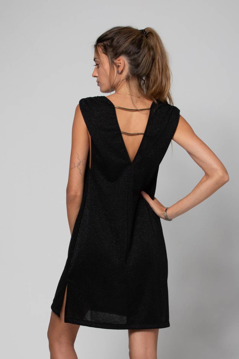La robe courte Noa en lurex noir avec décolleté plongeant en V devant et derrière, est la pièce incontournable pour toutes les femmes qui souhaitent ajouter une touche de glamour et de séduction à leur garde-robe. Cette robe courte est conçue pour mettre en valeur la silhouette féminine, avec son décolleté plongeant et ses fentes sur les cuisses de chaque côté, pour un look à la fois élégant et audacieux.