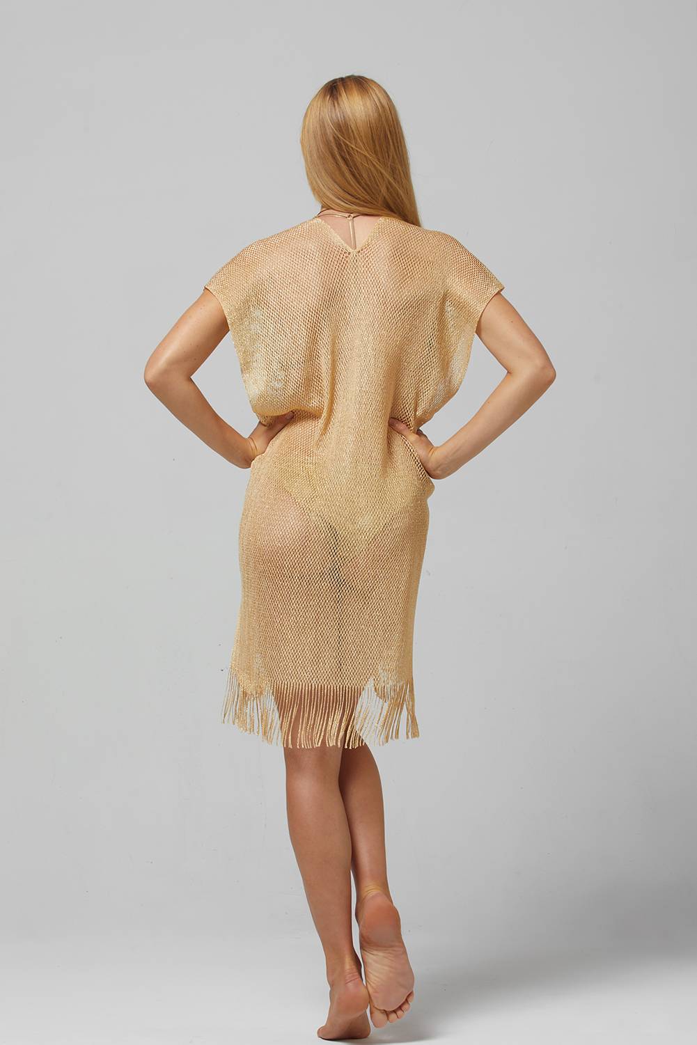 Les caractéristiques du poncho court de Plage doré à franges sont les suivantes :