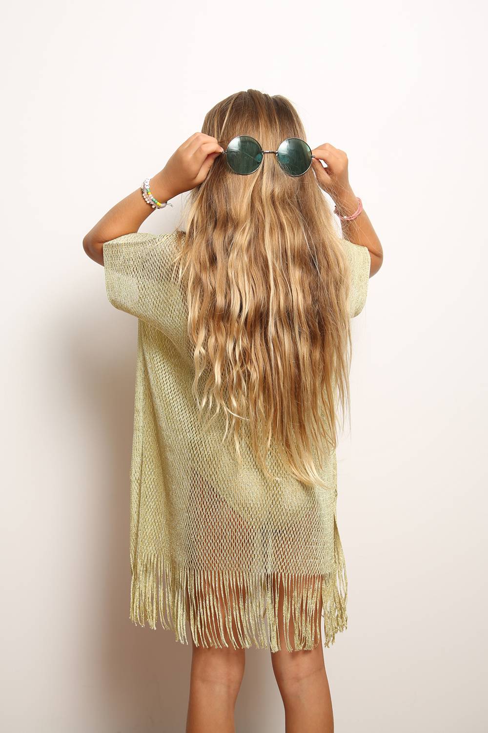 Commandez dès à présent ce poncho pour enfant en maille, doré et pailleté afin d'apporter de la gaieté aux journées plage de votre fille.